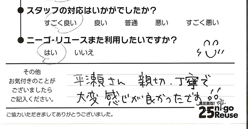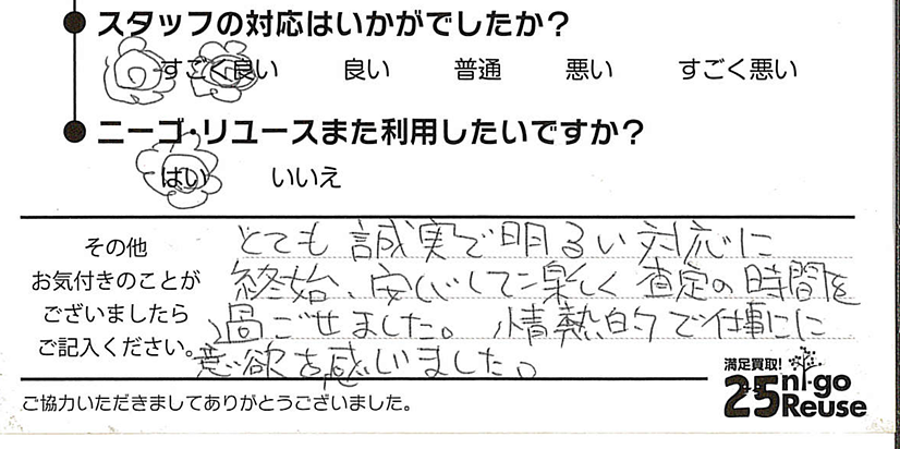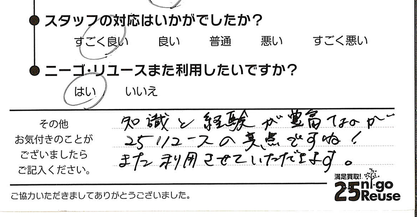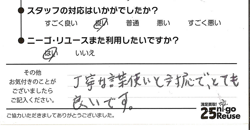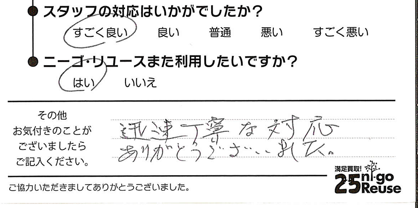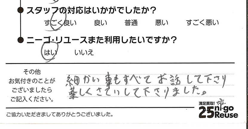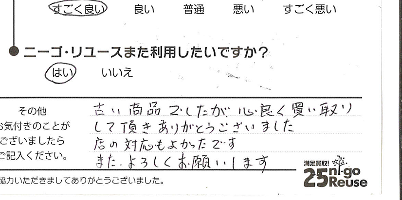ニーゴ・リユースは無理な交渉はいたしませんので、もし買取金額にご満足いただけない場合はお断りいただいても大丈夫です。その際も費用などは一切発生しません。 また、クーリング・オフも対応させていただきますのでご安心ください。
