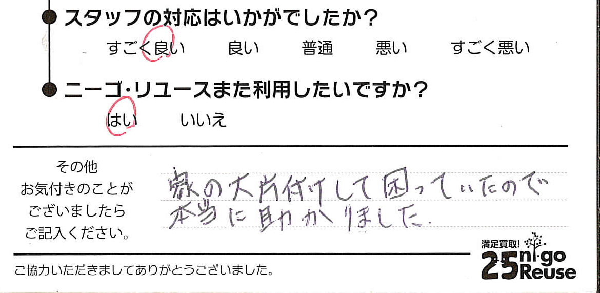 - 申し込みをしてから速い対応で助かりました。 自分では中々捨てられないので。